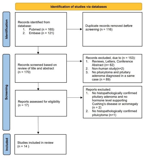 We searched PubMed and Embase from database inception to November 2021 for relevant studies by using the terms “pituicytoma” combined with “pituitary adenoma,” “Cushing,” “hypercortisolism,” or “acromegaly” (Figure 5). Only publications with the full text in English were reviewed. We included all cases of patients with confirmed comorbidity of pituicytoma and pituitary adenoma. Furthermore, cases of patients with sufficient data supporting a biochemical diagnosis of CD or acromegaly were included even when a histopathologic examination confirming pituitary adenoma was lacking. Cases of patients with neither histopathologically confirmed pituitary adenoma nor a clinically confirmed biochemical diagnosis of CD or acromegaly were excluded. In total, 18 patients were considered in this study, comprising 14 patients with the comorbidity of pituicytoma and confirmed CD, 3 patients with the comorbidity of pituicytoma and acromegaly, and 1 patient with the comorbidity of pituicytoma and nonfunctional pituitary adenoma. Table 3 presents the clinical and pathological characteristics of patients with CD included in this study.