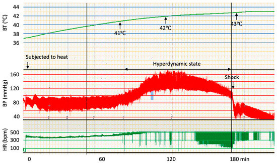The typical time course of body temperature, blood pressure, and heart rate of a rat subjected to heat. With increasing body temperatures, first a high blood pressure was detected. Then, a hyperdynamic state continued until the body temperature reached 42.5 °C. Eventually, a sudden decrease in blood pressure was observed and animals went into shock when body temperatures approached 43 °C.