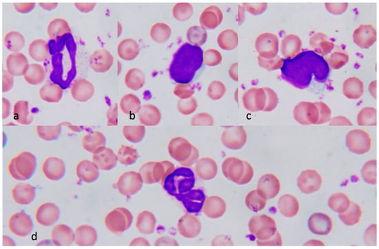 Normal blood cells. Neutrophil shows sausage or donut-shaped nucleus and fine Azur granules in the cytosol (a). Lymphocyte has oval (b) or notched (c) nucleus and small blue-stained cytosol. The nucleus of the neutrophil is sometimes twisted but not hyper-lobulated in normal conditions (d). Polychromatophilic erythrocytes are less and platelets are not aggregated.