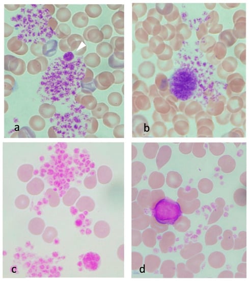 For the blood cell count, fresh citrated blood samples were analyzed by an impedance hematology analyzer (PocH-100iV Diff®, Sysmex Corp., Kobe, Japan) [10]. For the morphological examination, peripheral blood films were prepared as thin blood smears, which were fixed in methanol, stained in 10% May-Giemsa stain (GS-10®, Sigma-Aldrich, Inc., St. Louis, MO, USA), and examined under the light microscopy at a maximum of 1000× magnification using oil immersion. As for the bone marrow smears, aspirated bone marrow specimens obtained from the femur were suspended in saline solution, then fixed in methanol, stained in 10% May-Giemsa stain, and examined under light microscopy in the same manner with a peripheral blood smear.