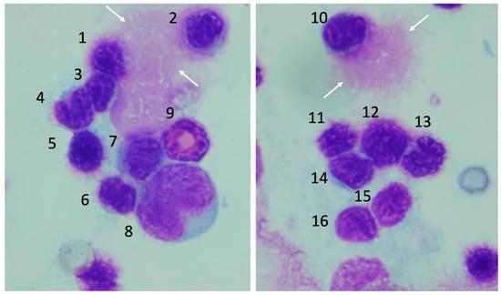 Bone marrow smear in the lethal model of heatstroke. Severe cellular damage was recognized in the bone marrow smear obtained from severe heatstroke group. Burst nuclei are indicated by the white arrows. 1: damaged erythroblast, 2–4 damaged lymphocytes, 5: damaged erythroblast, 6, 7: damaged lymphocytes, 8: promonocyte, 9: eosinophilic band cell, 10: burst lymphocyte, 11–13 damaged erythroblasts, 14–16: lymphocytes.