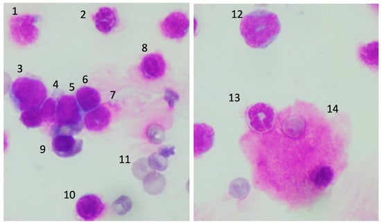 Bone marrow smear in the sublethal model of heatstroke. Bone marrow cells were less damaged in the sublethal model of heatstroke. 1: lymphocyte, 2: neutrophilic band cell, 3: promonocyte, 4–6: lymphocytes, 7: damaged neutrophilic band cell, 8: damaged cell, 9: erythroblast, 10: damaged lymphocyte, 11: reticulocyte, 12: myelocyte, 13: band cell, 14: megakaryocyte.