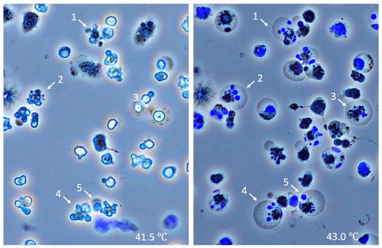 Leukocytes stopped moving and started to shrink at 40 °C, and some fragmented into apoptotic bodies, suggesting that apoptosis was initiated at 41.5 °C (Figure 7, left). When the temperature reached 42.0 °C, the cytoplasm of apoptotic cells ballooned, and the apoptosis was suspected to turn into necrosis. At 43.0 °C, most of the half-apoptotic leukocytes progressed to complete necrosis (Figure 7, right).