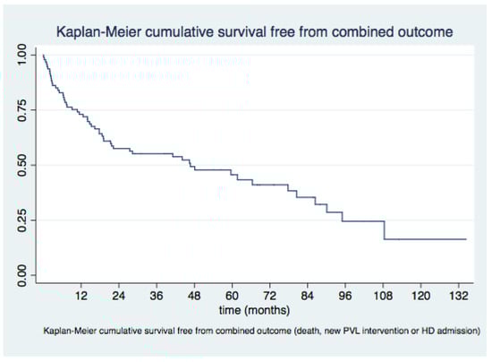 Overall, we presume that the long-term outcomes observed in our study can be at least partially justified by the high-risk baseline profile and poor survival rates of patients undergoing mitral valve replacement, as previously reported [,]. Of note, surgical as opposed to percutaneous PVL closure did not improve overall survival when adjusted by baseline patient’s characteristics, which depicted a substantially higher risk profile among patients assigned for percutaneous therapy []. Although prior surgical series have reported survival rates as high as 39% on long-term follow-up 12 years after the procedure [], these results cannot be compared directly with the findings of our study, since surgery was performed in a younger and lower risk patient population.