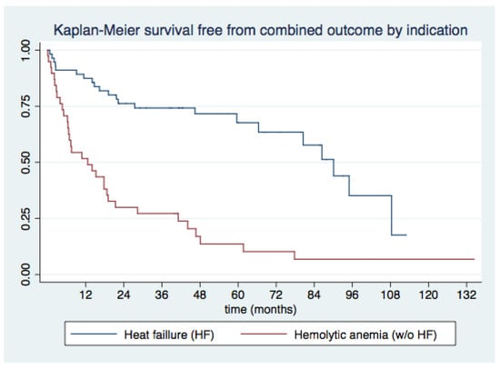 Kaplan–Meier plots for survival and survival free from MACE for the overall sample and according to the indication for PVL closure (HF vs. AH) are shown in Figure 3 and Figure 4, respectively.