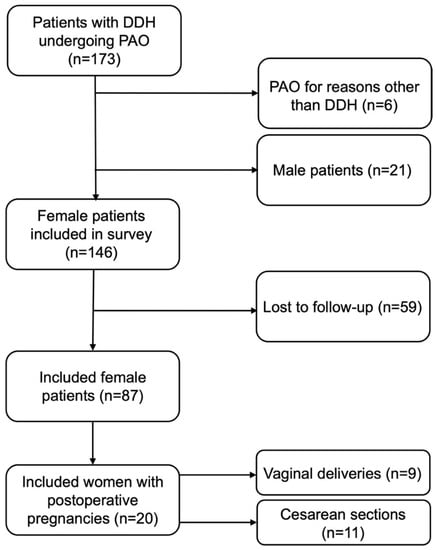 A total of 173 patients with 202 PAOs were identified. Six PAOs were excluded due to diagnoses other than DDH. Of the remaining patients, 146 patients with 165 PAOs were female. In total, 87 patients (59.6%) completed the PAO-related questions, while 57 patients (39.0%) completed the pregnancy-related questions, of whom 20 (22.7%) gave birth to 26 children after PAO (Figure 2).