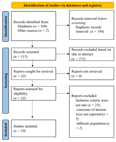 Our search in pre-specified databases and sources retrieved 511 references. Afterward, duplicate records were excluded. The remaining 315 articles were initially screened for eligibility based on title or abstract, and 273 records were excluded. In the next step, 42 records were assessed in full text for inclusion and exclusion criteria. Finally, 10 studies that fulfilled the inclusion criteria were included in the present systematic review (Figure 1).