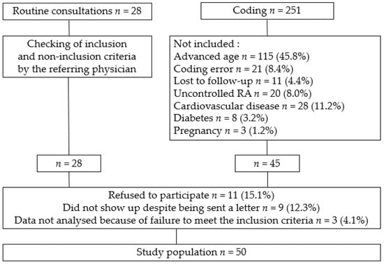 The recruitment process identified 251 patients through coding (International Classification of Diseases 10th Revision, immunopositive RA and immunonegative RA) and 28 through routine consultations between April 2020 and June 2021. Two hundred and twenty-nine were not included for various reasons that are shown in Figure 1. Notably, with more advanced age came a systematic increase in their cardiovascular risk according to the SCORE chart, in accordance with the inclusion criteria, these so-called “advanced age” patients have been not included. Fifty RA patients were retained for this study and their characteristics are reported in Table 1.
