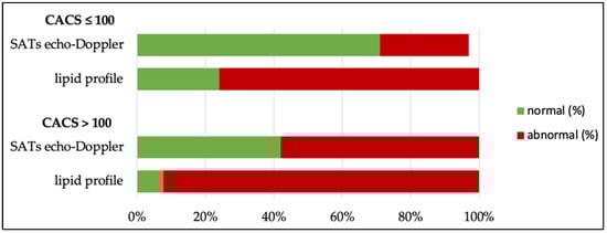 Atherosclerosis is classically assessed using a lipid profile and a SATs echo-Doppler test. As Figure 2 shows, only one patient in the CACS > 100 group had a lipid profile within the target ranges, meaning that 91.6% [64.6; 98.5] vs. 76.3% [60.8; 87. 0] in the ≤100 group had abnormalities; respectively, seven (58.3% [32.0; 80.7]) vs. 26.3% [15.0; 42.0] patients showed atherosclerotic plaques on the SATs echo-Doppler test. The CACSs led to the reclassification of five patients without atheromatous plaques in their SATs into the high cardiovascular risk group. Indeed, CACSs identified high-risk patients in a similar way to that of the echo-Doppler detection of atheromatous plaques on carotid or femoral arteries [8].