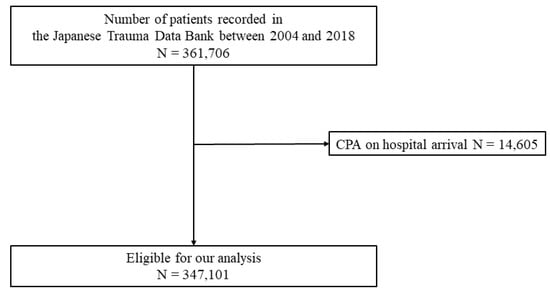 This was a retrospective observational study using the JTDB database. The study period spanned 15 years from January 2004 to December 2018. We included all emergency trauma patients registered in the JTDB database. We excluded patients with cardiopulmonary arrest on hospital arrival. Cardiopulmonary arrest on hospital arrival was defined as a systolic blood pressure of 0 mmHg and/or heart rate of 0 beats per minute on hospital arrival [5].