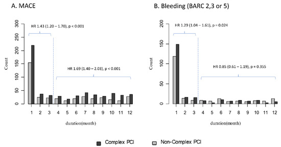 In Table 4, the risk of BARC 2, 3 or 5 bleeding was significantly higher in the complex PCI group (12.0% vs. 9.7%; HR: 1.26, 95% CI: 1.12–1.42, p < 0.001). On the other hand, it became non-significant after multivariable adjustment or PS matching. Interestingly, during the initial three months, the risk of BARC 2, 3 or 5 bleeding was significantly higher in the complex PCI group, even in the PS-matched cohort (Figure 5 and Table S1). Beyond three months, there was no difference in overt bleeding between the two groups (Figure 4B and Table S2). In our cohort, there was no significant difference in the number of patients prescribed potent P2Y12 inhibitors (ticagrelor or prasugrel) at discharge or in the number of patients who continued to use the drug for one year between the complex PCI group and the non-complex PCI group (12.6% vs. 13.3%, p = 0.341; 9.9% vs. 10.8%, p = 0.216, respectively) (Table 1). Among patients with BARC 2, 3 or 5 bleeding events within a year, the number of patients prescribed potent P2Y12 inhibitors as discharge medication and the number of patients who were still using the drug at one year was higher than those who were not, but there were no significant differences (13.7% vs. 12.5%, p = 0.190; 11.9% vs. 10.5%, p = 0.249). In addition, there was no significant difference in extended dual antiplatelet usage over one year in the complex PCI and non-complex PCI groups (56.6% vs. 54.9%, p = 0.137).