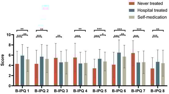 Comparison of B-IPQ item scores among participants with respiratory allergies in different health-seeking-behavior groups. Abbreviation: B-IPQ, Brief Illness Perception Questionnaire. * p < 0.05, ** p < 0.01, *** p < 0.001 (item 3, 4, 7 modified).
