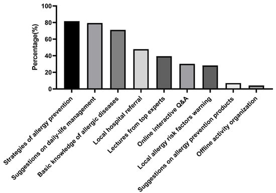 Among the 576 parents of the participants with respiratory allergies, 568 (98.6%) had tried to obtain disease-management information from online platforms. For the online platforms, 64.1% of the parents preferred Wechat allergy public accounts, followed by Apps (17.1%), Wechat applets (12.4%) and websites (6.7%). Their user patterns included proactively browsing for interested content (49.2%), browsing content in spare time (36.5%) and passively browsing updated content (14.3%). The majority of the parents (76.8%) hoped to receive the updated news weekly, followed by 3 times weekly (15.9%) and daily (7.3%). However, 55.5% (315/568) were dissatisfied with current platforms. The reasons included incomprehensive contents on the illness (45.7%), lack of voice from leading experts (40.3%), too many advertisements (37.5%) and similar contents from different platforms (36.8%) (Table 5). The most desired areas of improvement for the platforms included content on preventing allergic diseases (81.6%), recommendations for allergic children in daily life (79.4%) and basic knowledge of allergy diseases (71.1%) (Figure 2).