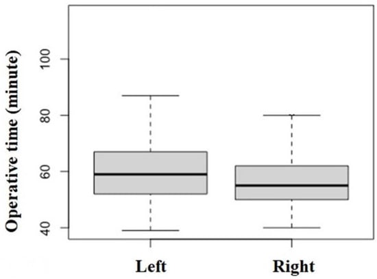 The current study showed laterality regarding operative time between the left and right sides. It was speculated that the main reason was a “distance difference” between the surgeon and scrub nurse during TKA. Further distances between the surgeon and the scrub nurse may lead to longer times to perform instrument handoffs or deliveries. During TKA, the surgeon usually stands on the side of the affected knee, and scrub nurses usually stand at the caudal (foot) side of the patient lying in the supine position. Therefore, scrub nurses are further from the surgeon’s dominant hand during non-dominant side surgery compared with the distance during dominant side surgery. In this study, the distance between the surgeon and scrub nurse was greater during left-side TKA than during right-side TKA. Because the number of procedural steps in TKA between the surgeon and nurse range from 159 to 230 [], even if the time discrepancy for one step between dominant- and non-dominant-side TKA might be only 1 s, the total time discrepancy would be approximately 3 or 4 min throughout the TKA surgery. Thus, in this study, TKA surgery on the left side (the surgeon’s non-dominant side) took longer than surgery on the right side because the surgeon was right-handed. The discrepancy in the median operative time between left- and right-sided surgery in this study was 4 min.