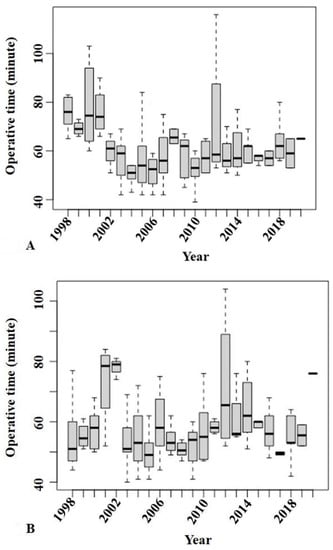 Because the surgical side was also related to operative time in the multiple regression analysis, the patients were divided into two groups according to the surgical side and we examined the trend in operative time with calendar year in each group. The results of the Jonckheere–Terpstra test showed a significant trend in decreasing operative time with calendar year for surgeries on the left side (p = 0.037) (Figure 2A) but not the right side (p = 0.795) (Figure 2B).