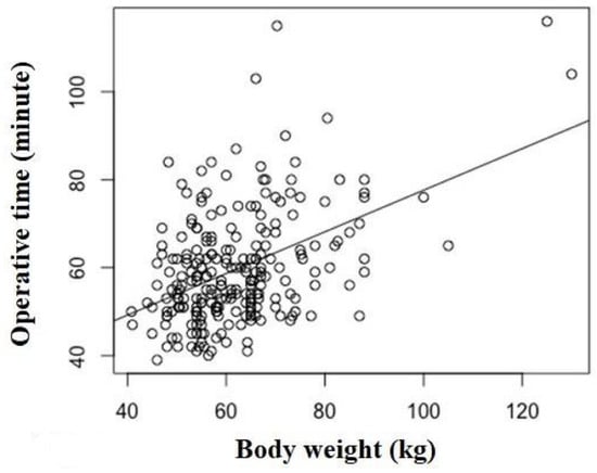 Correlation between operative time and body weight (BW) (r = 0.352, p < 0.001). BW showed a correlation with operative time in the multiple regression analysis.