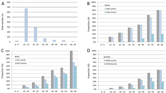 Included numbers of athletes and proportion of blood pressure deviations stratified for age by decade. Panel (A) Total numbers of included athletes stratified for age by decade. Panel (B) Proportion of athletes with exaggerated blood pressure response according to American Heart Association (AHA) guideline stratified for age by decade. Panel (C) Proportion of athletes with exaggerated blood pressure response according to European Society of Cardiology (ESC) guideline stratified for age by decade. Panel (D) Proportion of athletes with exaggerated blood pressure response according to American College of Sports Medicine (ACSM) guideline stratified for age by decade.