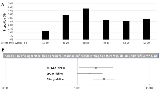 Exaggerated blood pressure response and left ventricular hypertrophy. Panel (A) Proportion of left ventricular hypertrophy stratified for age by decades. Panel (B) Association of exaggerated blood pressure response according to AHA, ESC, and ACSM guidelines with left ventricular hypertrophy.