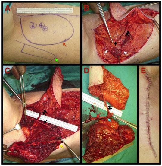 - Gibber, M.J.; Clain, J.B.; Jacobson, A.S.; Buchbinder, D.; Scherl, S.; Zevallos, J.P.; Mehra, S.; Urken, M.L. Subscapular system of flaps: An 8-year experience with 105 patients. Head Neck 2015, 37, 1200–1206. [Google Scholar] [CrossRef] [PubMed]