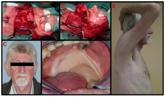 Seventy-four-year-old male patient with squamous cell carcinoma of the oral cavity: (A,B) intraoperative view after ablation of the squamous cell carcinoma of the oral cavity and modified radical neck dissection; (C) postoperative frontal view 8 months after reconstruction with the TDAP-Scap-aa flap; (D) intraoral postoperative clinical view depicting the totally integrated transplant involving the mandible, the tongue and the pharyngeal wall 8 months after reconstruction with this microvascular free flap (TDAP-Scap-aa free flap); (E) donor site 14 months after surgery. Full range of shoulder movement without restrictions. Note: Pictures are taken from case number 19.