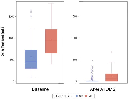 The SIU severity with the implant was also higher in patients with stricture regarding the 24-h pad count (median 1 vs. 0 pads; p < 0.0001) and 24-h pad test (median 70 vs. 0 mL; p < 0.0001) (Figure 1). The final cushion volume (median 17.5 vs. 14.5; p = 0.006) and number of fillings (median 3 vs. 1; p < 0.0001) were also higher in patients with stricture.