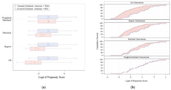After the weighted matched evaluation, 21 patients with previous stricture were weighted matched to 53 patients without stricture. The proportion of patients without stricture achieving dryness was 56%, not statistically different compared to the 38% of those with stricture (p = 0.236). The PSMATCHED procedure is shown in Figure 2.