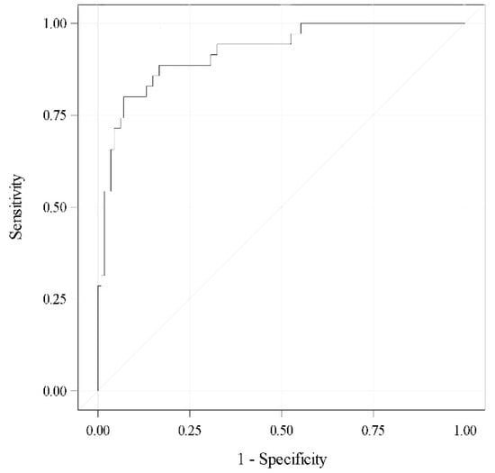 A multivariate analysis revealed the previous stricture (OR 4.66; 95% CI 1.2–18.87), baseline 24-h pad test (per 100 mL, OR 1.28; 95% CI 1.09–1.52) and final cushion volume (per mL, OR 1.34; 95% CI 1.19–1.55), which were independent factors predictive of failure; i.e., 24-h pad test ≥ 20 mL after ATOMS adjustment. The area under the curve (AUC) for this predictive model was 92% (Figure 3).