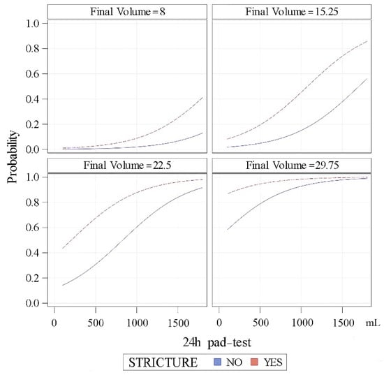 According to this model, the predictive probabilities for a patient to achieve dryness (24-h pad test ≤ 20 mL) can be calculated according to the baseline 24-h pad test and previous history of stricture for different filling volumes of the cushion (Figure 4).