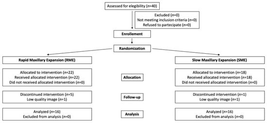 Every new patient adherent to inclusion and exclusion criteria was allocated to the RME group or the SME group using a computer program (www.random.org, accessed in 22 March 2022). Then, randomization results were consulted by statistician every time a new patient was enrolled. Patients who did not follow the activation protocol, did not come back for appointments, or whose structures were difficult to visualize on CBCT, were dropped from the study sample. The study was blinded regarding the statistical analysis, eliminating from the elaboration file every reference to patient group assignment. A consort diagram showing the flow of patients through the trial is provided in Figure 1. Finally, the RME group comprised 16 patients (12F, 6M) with a mean age of 8.50 ± 1.39 years and the SME group comprised 16 patients (11M, 5F) with a mean age of 8.96 ± 0.92 years.