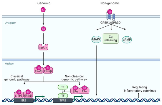 A scheme of estrogen receptors and the intracellular signaling pathway. In genomic pathway, 17β-estradiol (E2) binds to estrogen receptor α and estrogen receptor β in the cytoplasm. It forms dimer and translocates to the nucleus. Then, they bind to estrogen receptor element (ERE) and activate the transcription of downstream genes (classical genomic pathway). Or, they interact with other transcription factor (TF)s, such as NF-κB, specificity protein 1 (SP1), activator protein-1 (AP-1), and CCAAT/enhancer binding protein β (C/EBPβ), and prevent their binding to the transcription factor regulatory element (TFRE) (non-classical genomic pathway), leading to the regulation of their target gene expression. In non-genomic pathway, E2 binds to G protein-coupled estrogen receptor 1 (GPER1) and it regulates mitogen-activated protein kinase (MAPK), calcium (Ca) release, and cyclic adenosine monophosphate (cAMP). Created with Biorender.com.