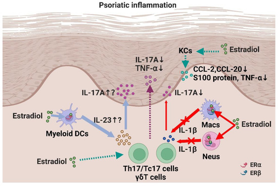 Keratinocytes play a critical role in psoriasis development [50,53,60]. Keratinocytes release multiple factors, such as damage-associated molecular patterns (DAMPs), CCL-20, and CXCL-1, 2, and 8 [1]. In vitro, the production of chemokines, such as RANTES and CCL-2, is inhibited by E2 in normal human keratinocytes [51,52]. Isoflavone genistein, which is the major metabolite of soy that binds to human ERα and ERβ, decreases MAPK, signal transducer and activator of transcription 3 (STAT3), NF-κB, and phosphatidylinositol-3 kinase (PI3K) activation in human keratinocytes, leading to decreased mRNA expression of CCL20, S100A7, and S100A9 induced by IL-17A and TNF-α [48,49,54]. These results suggest that E2 downregulates keratinocyte activation in psoriatic lesions.