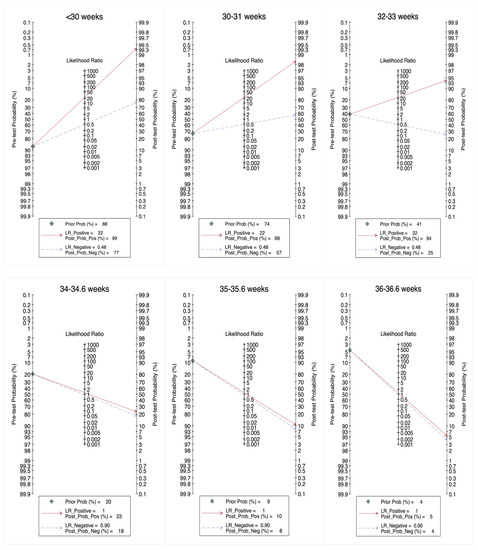Fagan nomogram analysis to evaluate the clinical utility of the prediction of neonatal respiratory morbidity by quantusFLM® in twin pregnancies. Pre-test probabilities of neonatal respiratory morbidity in twins were obtained from Clin Chim Acta 484 (2018) 293–297 for <30.0 up to 33.6 weeks [22] and from BMJ 2016;354: i4353 for 34.0 up to 36.6 weeks of gestation [3].