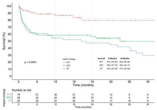 According to the intention-to-treat analysis (Figure 3), actuarial survival was considerably higher in BTT compared to other implantation strategies (log-rank < 0.001).