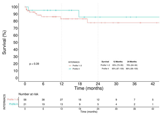 Kaplan–Meier analysis of survival among INTERMACS Profile 1–3 and Profile 4 BTC patients.