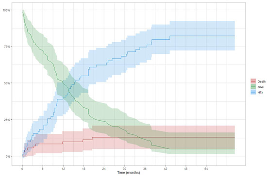 In the BTT group (Figure 4), 12-month and 24-month survival was 83% (73–95) and 78% (64–94) in Profile 1–3 patients and 95% (87–100) and 86% (68–100) in Profile 4 patients, respectively (log-rank = 0.390). A competing analysis was conducted in the BTT cohort to evaluate the cumulative risk of a patient being alive, HT, or dead (Figure 5). One year after the implantation, 40% of the patients were transplanted, and less than 10% died. These percentages increased, after two years, to more than 62% of patients receiving an HT and an overall mortality rate of 13%.