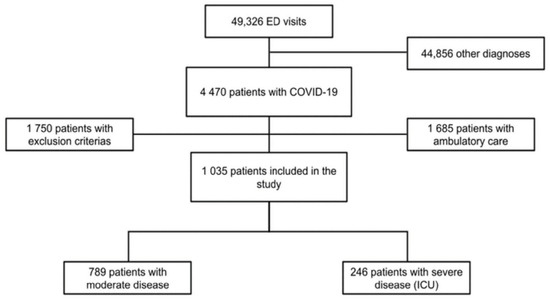 During the study period, a total of 49,326 patients were admitted to the EDs of all six hospitals. Of these patients, 4470 had a laboratory-confirmed SARS-CoV-2 infection, 1685 received ambulatory care, 1750 met the exclusion criteria and, in fine, 1035 patients were included in our study (flowchart: Figure 1).