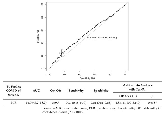 We made a receiver operating characteristics (ROC) curve to predict the risk of disease severity. Regarding the PLR during admission, the area under the curve (AUC) was 0.54 (95% CI: (0.497–0.582)). The best cut-off for predicting the risk of infection severity was 369.7; it yielded a sensitivity of 23.8% (95% CI: (18.6–29.7)) and specificity of 83.8% (95% CI: (81.0–86.3)). In the multivariate analysis, if PLR was greater than 369.7, the OR was valued at 1.884 (95% CI: (1.130–140), p = 0.015) (Figure 2).