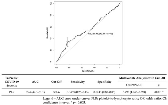 We created receiver operating characteristics (ROC) curves to predict the risk of disease mortality. Regarding the PLR at admission, the area under the curve (AUC) was 0.55 (95% CI: (0.498–0.611)). The best cut-off for predicting the risk of infection severity was 356.6: it yielded a sensibility of 34.3% (95% CI: (26.3–43.0)) and a specificity of 82.4% (95% CI: (79.7–84.9)). In the multivariate analysis, if the PLR was greater than 356.6, the OR was valued at 3.793 (95% CI: (1.946–7.394), p < 0.001) (Figure 3).