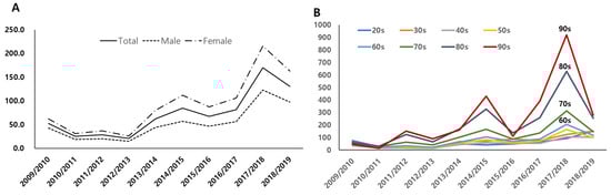 Although the 2009 H1N1 influenza pandemic, which began worldwide in April 2009, was associated with high mortality [,], data are limited on how the seasonal influenza epidemics have changed in terms of disease severity and healthcare utilization since the pandemic season. Hence, we conducted this 10-year investigation starting the 2009 pandemic season. In South Korea, cases (of the 2009 H1N1 pandemic) began to increase in late August 2009 and lasted until December 2010 []. Therefore, some cases of hospitalization or mortality from the 2009/2010 season may have been missed in our study. However, studies from U.S., the United Kingdom, and China (Shanghai) indicate that since the decline of the 2009 H1N1 pandemic outbreak, the rates of hospitalization have increased again, with a peak during the 2017/2018 season [,,,]. These data are consistent with our results. Although the rate of hospitalization was higher in females than in males in our study, a previous study using the HIRA data also reported similar results []. However, gender difference can vary among different seasons and countries [,,,].