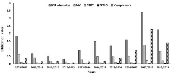 Regarding the ICU resource utilization, the frequency of MV, CRRT and ECMO use, as well as the rate of ICU admission, were investigated. Considering the high costs and impacts on morbidity and mortality, these variables seem relevant to answer our research questions. However, the rates of ICU admission in our cohort (0.32~3.37/100,000 population) and the United Kingdom (0.06~0.22/100,000 population) [] seem to be lower, compared to that in the U.S. (5.7~11.6/100,000 population) or Canada (14.4%) [,,]. This may be explained by the different ICU capacities or triage among hospitals or countries. Besides, the rate of MV use in our cohort (0.4~1.6% among hospitalized patients) seems lower, compared to that of the US (15.6~25.0%), Spain (8.9%), Canada (8.6%) and Germany (3.4~6.7%) [,,,,]. This different rate could be linked to different disease severities or proportions of do-not-intubate orders among countries. Particularly, the number of ECMO cases was very low. Although we think all billing claims were processed for all ECMO cases nationwide, a possibility of underestimation of ECMO cases cannot be ruled out. However, of note, recent reports demonstrated that influenza vaccination can reduce the severity of disease in patients with influenza or even COVID-19 [,,]. Hence, the high vaccination rate (>80% in those aged 65 and older) in South Korea might contribute to this lower rate of ICU admission and MV use in our study. However, the Korean national influenza surveillance system reported an increased incidence of influenza-like illness in the 2017/2018 seasons (Supplementary Table S9). The CDC also indicated that the 2017/2018 season had high severity, with unusually high rates of outpatient flu-like illness, hospitalizations, and complications []. Increased disease severity or availability of machines may be responsible for the increasing trend of ICU resource use [].