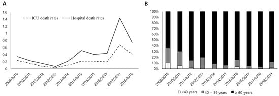 Descriptive analyses were used to summarize characteristics of the hospitalized patients with influenza. Data are presented as means ± standard deviations or median (interquartile ranges, 25th–75th percentiles) for continuous data and as frequency (percentage) for categorical data. To compare the hospitalization rates between years, the age-adjusted rates of hospitalization were calculated, using the annual mid-year population census (the Korea Statistical Information Service) as the standard []. We investigated the longitudinal trends over 10 years (2009–2019) in the use of critical care resources, such as ICU admission, vasopressors, MV, CRRT, and ECMO, as well as in-hospital mortality rate. For these data, Cochran–Armitage trend test was used to detect yearly trends. Lengths of hospital and ICU stay were compared using the Kruskal–Wallis test because these variables were not normally distributed. Logistic regression analysis was performed to see the effects of type of hospitals and the seasons on in-hospital mortality, adjusted for age, gender, CCI, and the use of ICU resources. All statistical analyses were performed using R version 4.0.5 (R Foundation Inc.; https://www.r-project.org/, accessed on 28 February 2022). For all analyses, p < 0.05 was considered to indicate statistical significance.
