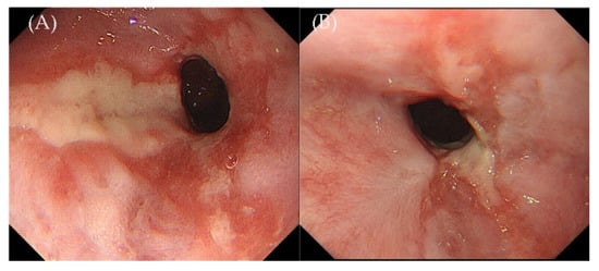 - Tilbe, K.S.; Lloyd, D.A. A case of viral esophagitis. J. Clin. Gastroenterol. 1986, 8, 494–495. [Google Scholar] [CrossRef]