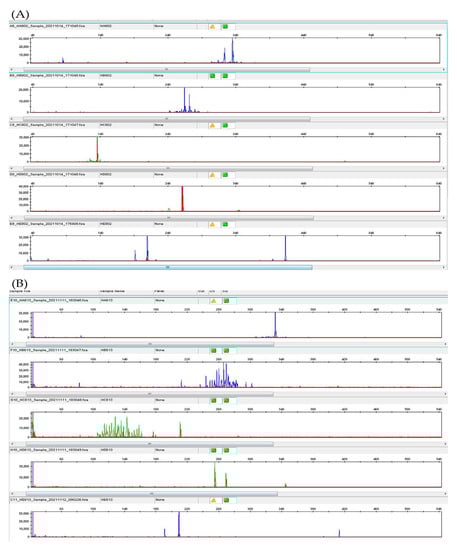 From top to bottom. (A) IgH rearrangement of esophagus biopsy: target segments FR1-JH, FR2-JH, FR3-JH, DH-JH display monoclonal. (B) IgH rearrangement of parotid biopsy: target segments FR1-JH, and DH-JH display monoclonal.