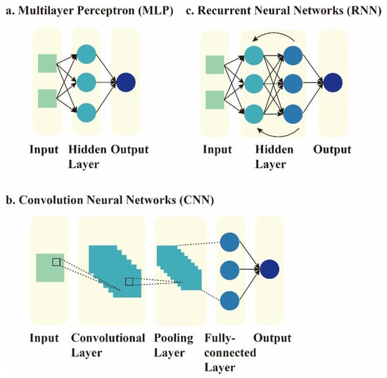 AI refers to imitating natural intelligence perception and decision-making strategies in computers to take optimal actions that are not explicitly programmed for the goals [3,4]. ML is a branch of AI concerned with algorithms necessary to train a model to acquire, integrate, and learn new knowledge based on large-scale observations and empirical data [5]. ML has been broadly applied in complicated tasks, including image analysis and automatic natural speech processing [6,7,8]. Deep learning is a subclass of ML characterized by an algorithm that can combine raw inputs into multi-layered neural networks with millions of neuron-like units, which mimics the human brain’s ability to conduct data interpretation and significantly improve overall performance [9,10]. Artificial neural networks (ANNs), which involve multiple layers between input and output, are known as deep neural networks (DNNs). The most commonly used DNN types are multilayer perceptron (MLP), convolution neural networks (CNNs), and recurrent neural networks (RNNs) (details are shown in Figure 1).