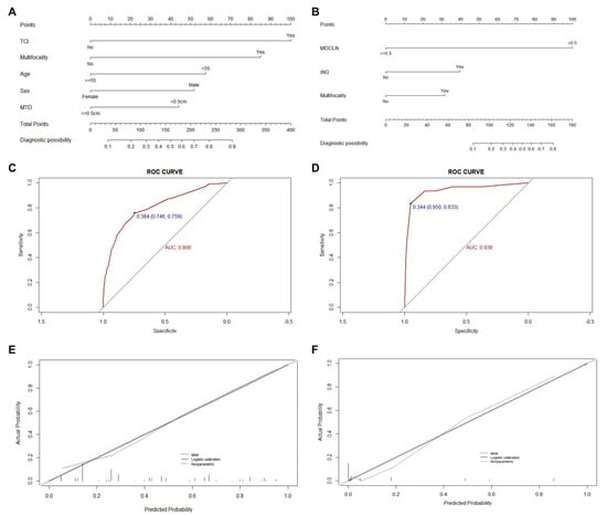 The result of the univariate and multivariate regression analyses showed that five factors (age less than 55 years old, male, MTD ≥ 0.5cm, and the presence of TCI and multifocality) were proven to be independent risk factors of CLNM for PTMC patients within the Uni group (Shown in Table 3). Meanwhile, for patients with positive CLNM, the result of multivariate analysis exhibited that three factors (maximum diameter of positive CLN (MDCLN) > 0.5cm, the presence of multifocality, and iNG) were screened out as independent risk factors of LLNM. The prediction models for quantitatively assessing the risk of CLNM and LLNM for all patients within the Uni group and unilateral patients with positive CLNM respectively were then created based on the independent risk factors described (Shown in Figure 1A,B). To validate the accuracy of the newly created nomogram, an internal validation by 1000 bootstrap resamples was performed and assessed in terms of the C-index. Validation results returned a C-index of 0.806 (95% CI, 0.769–0.843), and 0.803 (95% CI, 0.790–0.816) after bootstrapping, demonstrating our nomogram’s excellent accuracy in CLNM risk prediction. The ROC curve and the calibration plot are shown in Figure 1C,E, both exhibiting satisfactory agreement between the actual and predicted probability of CLNM for patients in the Uni group. For the nomogram used to assess the risk of LLNM in unilateral patients with positive CLNM, a C-index of 0.938 (95% CI, 0.881–0.994) was yielded, and 0.931 (95% CI, 0.913–0.949) after bootstrapping. The ROC curve and the calibration plot (Shown in Figure 1D,F) also confirmed high efficiency and accuracy for predicting LLNM.