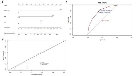 Three factors including age less than 55 and the presence of TCI and multifocality in at least one side of the thyroid lobe were confirmed as independent risk factors of CLNM for patients within the Bil group by multivariate analysis (shown in Table 4). Similarly, the prediction model for quantitatively assessing the risk of CLNM for these patients was established (shown in Figure 2A), and the ROC and the calibration curves were plotted and shown in Figure 2B,C, both indicating a high degree of accuracy of our newly created model (with C-index of 0.783 (95% CI, 0.706–0.860) and 0.776 (95% CI, 0.754–0.798) for training group and after bootstrapping respectively).