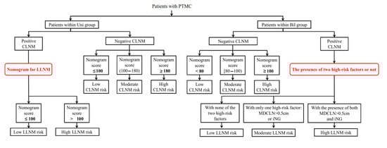 Existing literature showed that factors such as upper portion tumor and a high count of positive central lymph nodes are independent risk factors of LLNM for PTMC patients [,]. Here in our research, the risk of LLNM was also quantitatively analyzed for PTMC patients within the Uni group. The LLNM risk for patients in low LLNM risk subgroup was only 2.0% yet could reach up to 72.2% for those in the high LLNM risk subgroup. For those in the Bil group, only two factors including the presence of iNG and the maximum diameter of positive lymph nodes in the central compartment >0.5 cm were confirmed as independent factors, and those with none of these two factors showed an extremely low LLNM risk. Given that those exhibiting both of these two risk factors showed a high LLNM risk of 72.7%, the rationality and validity of our classification are confirmed. For unilateral and bilateral patients within high LLNM risk groups according to their respective prediction models, a more frequent postoperative follow-up schedule is necessary. For those defined as having low LLNM risk, therapeutic CLND is enough and no additional intervention involving the lateral neck is needed.