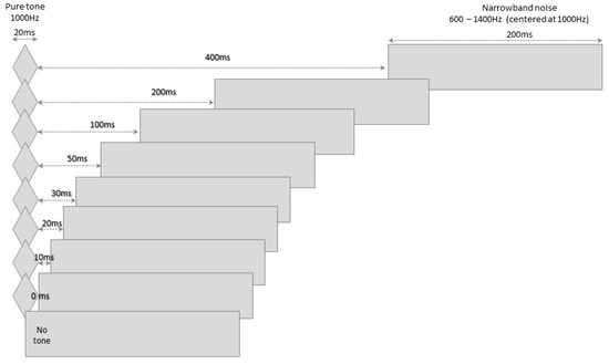 The BMT was developed based on established information regarding temporal masking [4,32,36,37,38,39,40]. The test involves presenting a 20 ms long (10 ms onset/offset) pure tone (1000 Hz) and a 200 ms long narrowband masking noise (600 Hz to 1400 Hz), separated by one of eight possible intervals: 400, 200, 100, 50, 30, 20 10 and 0 ms.