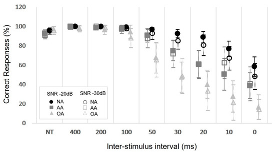 Overall performance per ISI in the NA group remained constant at longer intervals (100–400 ms) and declined as the intervals shortened, from 50 ms onwards, in both ears and at both SNRs. In the AA group, performance started to decline at 100 ms, and, in the OA group, the decline in performance could be seen as early as 200 ms. The difference between groups’ performances per ISI became more pronounced as the ISIs shortened (Figure 2). For the NA group, there were no interactions between SNR, ear and ISI duration (SNR × ear × ISI: χ2 (7) = 11.414, p = 0.122; ear × ISI: χ2 (7) = 5.869, p = 0.555; SNR × ISI: χ2 (7) = 9.238, p = 0.236; SNR × ear: χ2 (1) = 0.166, p = 0.684). However, differences were observed in the number of correct responses between ISIs, regardless of the SNR or ear assessed (χ2 (7) = 212.532, p < 0.001), and between SNRs, regardless of the ISI or ear assessed (χ2 (1) = 4.697, p = 0.030). In general, for the ISIs, there was a statistically significant difference (p < 0.05) between the longest (100–400) and shortest time intervals (20, 10 and 0 ms), with significantly worse performance in the latter. For the SNR, worse performance was observed at −30 dB in comparison to the −20 dB condition. No statistically significant effect was observed for the ear assessed (χ2 (1) = 0.912, p = 0.340).