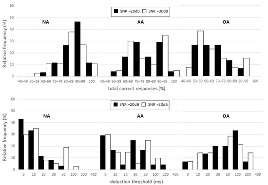 Based on the distribution of participants according to test performance percentage, there was a slight shift in the distribution of results towards worse performance at SNR −30 dB for both BMTP and BMTT. However, performance in correct responses for most of the individuals in the NA group was equal to or greater than 80% at both ratios (SNR −20 dB: 85% of ears; SNR −30 dB: 82% of ears). Thresholds lower than or equal to 20 ms were recorded in 88% of ears at SNR −20 dB and 80% of ears at SNR −30 dB. Additionally, thresholds equal to or higher than 50 ms were obtained by only 3 and 14% of ears at SNRs of −20 and −30 dB, respectively. For the OA and AA groups, greater BMTP and BMTT variability was observed. In the AA group, 50% of ears had a BMTP of 80% or greater at both SNRs, while only 29 and 24% of ears in the OA group had a BMTP of 80% or greater at SNR −20 and −30 dB, respectively. Regarding BMTT, the AA group showed thresholds lower than or equal to 20 ms in 50% of ears at SNR −20 dB and in 60% of ears at SNR −30 dB, while thresholds equal to or higher than 50 ms were observed in 25 and 35% of ears in the respective conditions. For the OA group, these numbers were 29 and 35% of ears for thresholds lower than or equal to 20 ms and 53 and 65% of ears for thresholds equal to or higher than 50 ms (Figure 3).